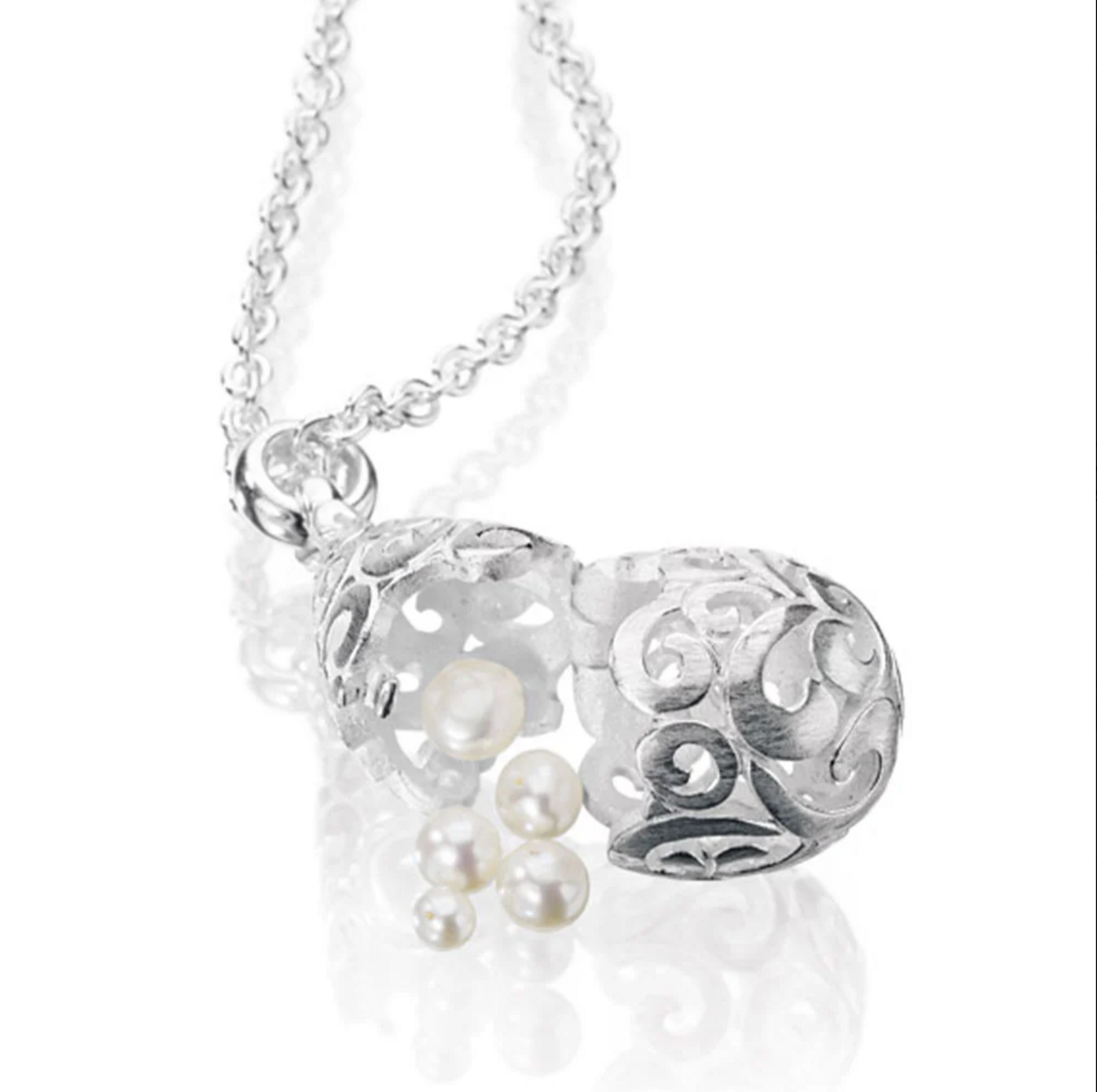Perlentau, großer Kegel Anhänger zum Aufklappen aus Silber.