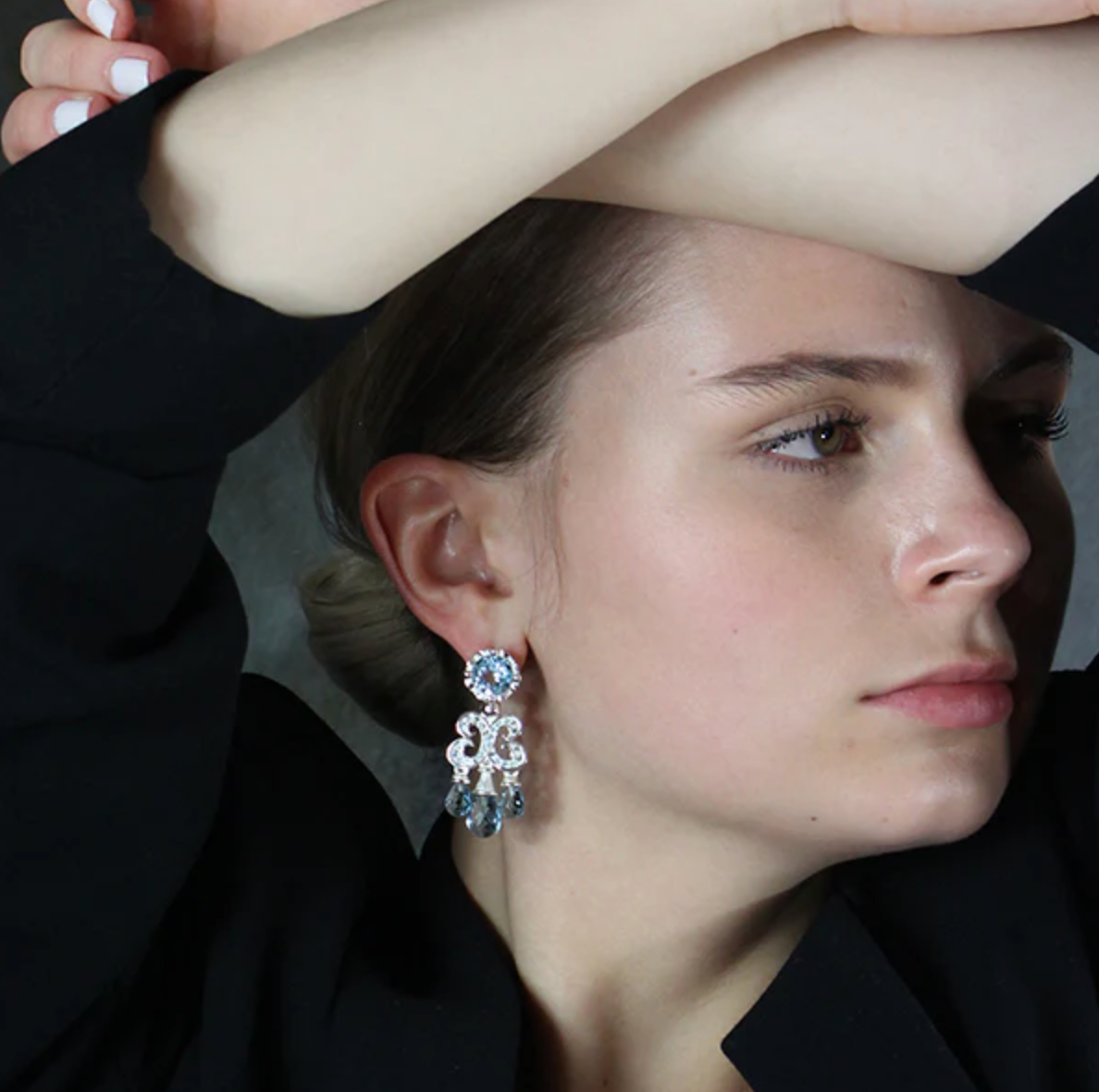 Diese königlichen Geschmeide mit ihrem strahlend blauen Funkeln über und über sorgen garantiert für einen großen Auftritt! Am Ohr funkelt der große facettierte runde Topas in einer prächtigen, wunderschön durchbrochenen Kronenfassung.