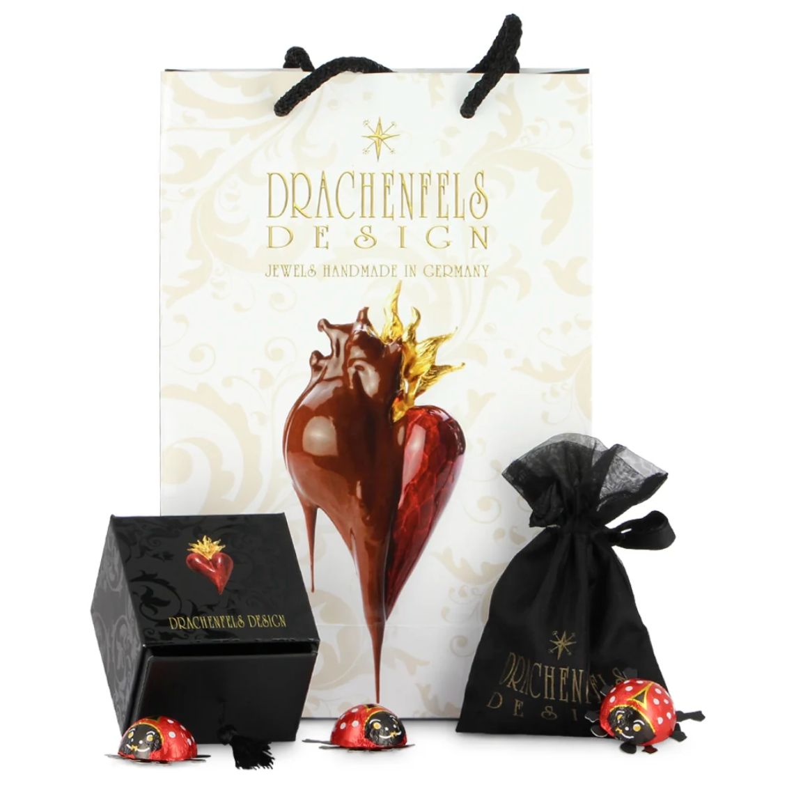 Wir liefern die märchenhaften Schmuckstücke im schönen Drachenfels Schmuckbeutel und der hübschen Drachenfels Geschenktüte.