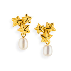 Drei kleine Sternchen haben zueinander gefunden und schmiegen sich aneinander, an das Sternentrio ist eine sanft schimmernde Süßwasserperle beweglich befestigt. Die wunderhübschen kleinen Sterne sind in ihrer Form und Anordnung nicht absolut symmetrisch (die Ohrringe sind aber gegengleich), das macht ihre Wirkung umso bezaubernder; auf ihrer Rückseite sind sie abgeflacht, dadurch liegen sie am Ohr schön an. Hier ist der Sternenglanz in edlem Metall zärtlich verarbeitet eingefangen, die samtigen Perlen verleihen dem Ohrschmuck zudem eine edle Note.