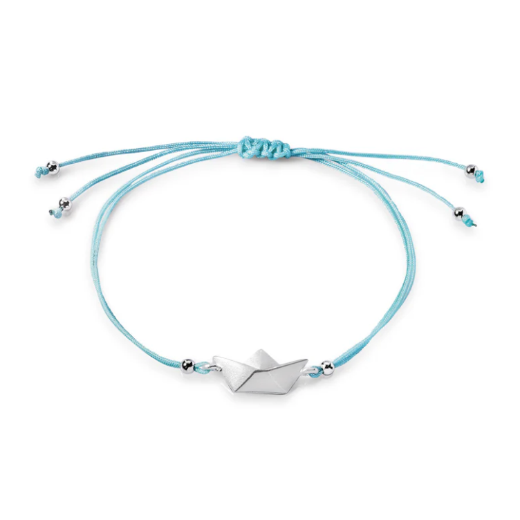 Kollektion Loveboat, trendiges Baumwoll Armband in der Farbe türkis mit Papierschiffchen aus Silber.