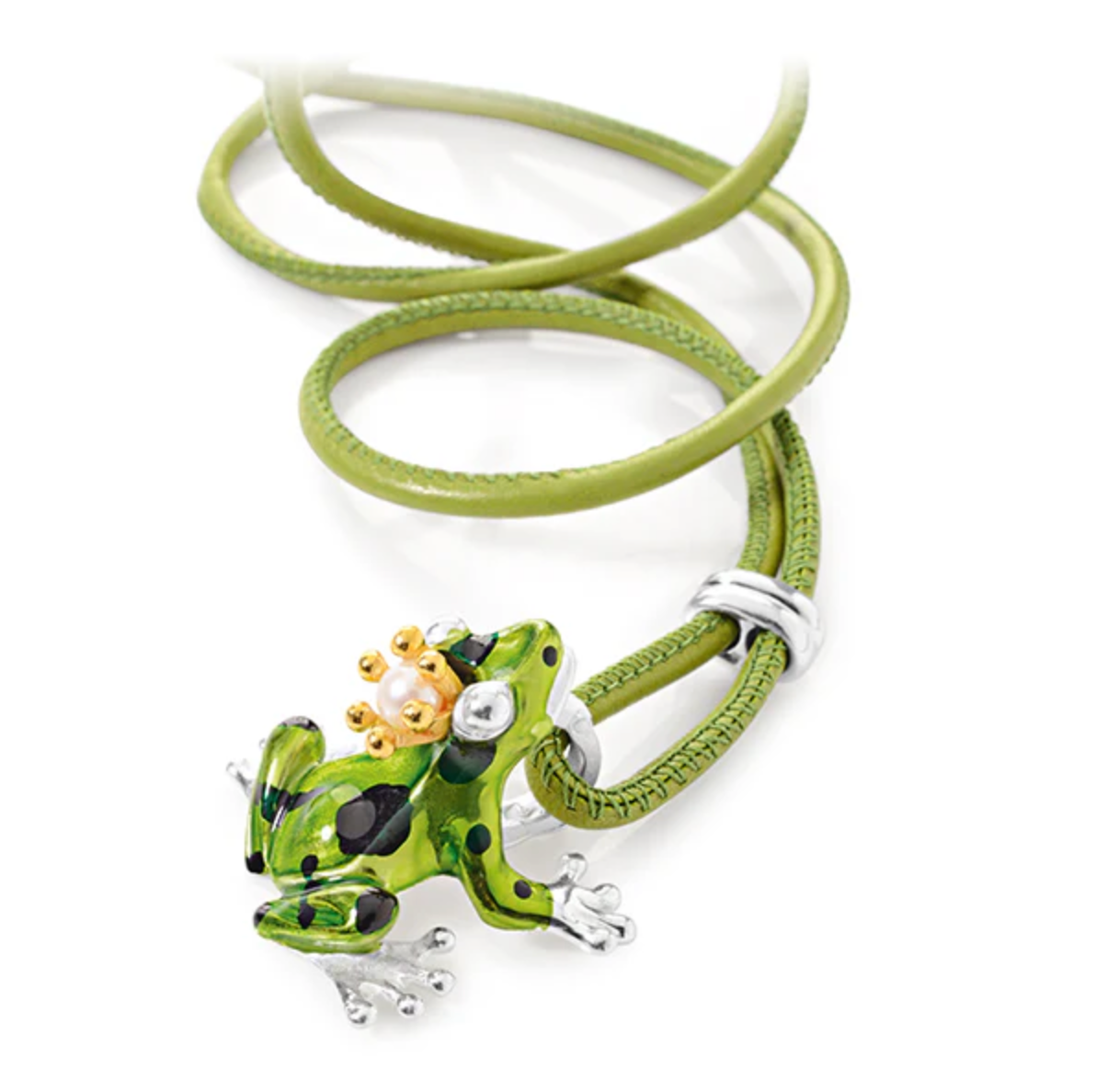 Der außergewöhnliche, große Frosch Anhänger ist bis ins kleinste Detail, mit schön gestalteter Krone, liebevoll ausgearbeitet und der perfekte Begleiter nicht nur für Königinnen. In seiner goldplattierten Krone glänzt die schimmernde weiße Perle. Seine intensive Farbe hebt ihn (und seine Trägerin) aus der Masse hervor.