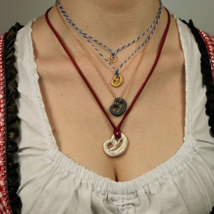 Unser Brezn Anhänger schmiegt sich zum Anbeißen schön an jedes Dekolleté. Ob als Accessoire zur Lederhose, zum Dirndl oder zum Alltagsoutfit - damit bist du mit Sicherheit der Hingucker.